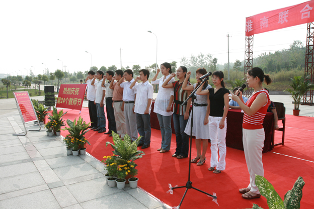在庄严的国歌声中,鲜艳的五星红旗冉冉升起。大会上,教师代表、新老生代表分别在会上发了言。新进教师进行了庄严宣誓。