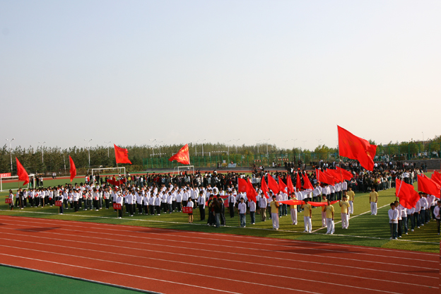在隆重热烈的气氛中,校党委书记吴淮建宣布本届田径运动会正式拉开帷幕。之后,举行了庄严的升旗仪式,在高亢嘹亮的国歌声中,鲜艳的五星红旗冉冉升到校园的上空。校长赵耀军致开幕词。裁判员代表、运动员代表在开幕式上庄严宣誓,表示要顽强拼搏,发扬风格,赛出水平,自觉遵守体育道德,作到公平、公正、公开执裁,保证运动会顺利进行。副校长尚文在开幕式上宣布了获得校“阳光体育运动”先进班级名单,校领导为其颁奖。