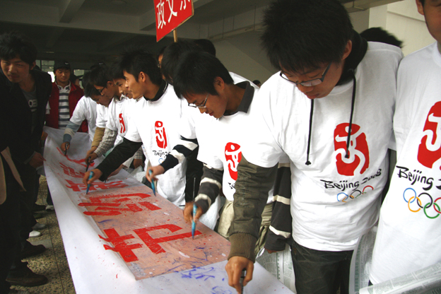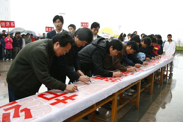 绿色家园社团负责人宣读了节水节电倡议书,团委负责人和学生会代表分别发言。倡议受到了全校师生的响应,在签名活动现场,600余名师生纷纷冒雨来到印有“迎奥运 树新风 创和谐节约新联大”的横幅前签名,用手中的笔表达了节约的愿望,也表达了建设和谐校园的决心。社团成员还现场发放了印有环保常识的宣传海报,整个活动持续了一个多小时。