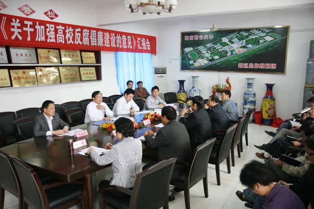 10月22日上午,省委教育工委高校反腐倡廉建设考评组一行四人,对beat365贯彻落实《关于加强高等学校反腐倡廉建设的意见》(以下简称《意见》)情况进行检查考评。校党委书记吴淮建,校长赵耀军,校纪委书记朱亚非,副校长尚文,校党委委员、工会主席刘为民出席了汇报会,相关部门负责同志参加了汇报会,会议由校党委书记吴淮建主持。