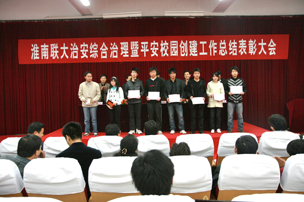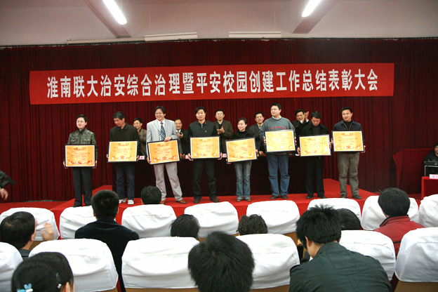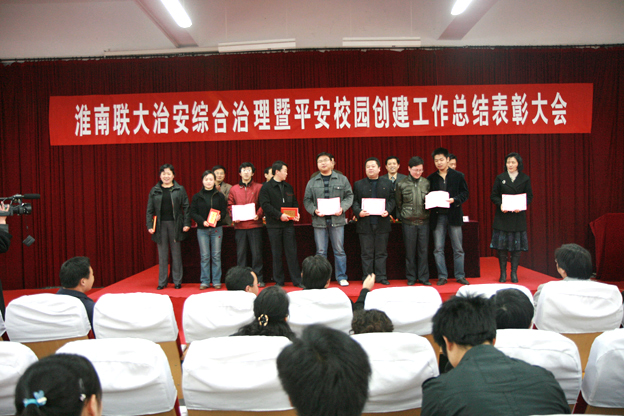 会上,纪委书记朱亚非宣读了《关于表彰2008年度社会治安综合治理暨“平安校园” 创建工作先进集体和先进个人的通报》。经过评选,有计算机系、总务处等8个单位获得综治工作先进集体荣誉称号,有旷莲英、韩氢氧等39名同志获得综治工作先进个人荣誉称号,有王萍、汪泽存等11名同志获得综治工作先进模范个人称号,有李燕峰、丁玉奎等87名同学获得遵纪守法标兵荣誉称号。出席大会的校领导为获奖单位和个人颁发了奖状及荣誉证书。