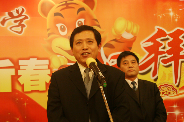 万继军在致辞中代表学校党委、党政领导班子成员向全校师生员工,离退休教职工,向关心、支持学校发展建设的老领导、老同志和社会各界人士致以节日的祝贺!祝大家新春快乐,身体健康、工作顺利,阖家幸福!万书记说,刚刚过去的2009年,我们凝心聚力,众志成城,在教育教学改革、人才培养、师资队伍建设、科研实训、对外交流合作以及加强党建等方面取得了可喜的成绩,采取有效措施防控甲型H1N1流感疫情;这一年我们奋发有为、锐意进取,完成了新校区实训大楼的奠基,成功举办了建校25周年庆祝活动,成功申报获准国家专利和省级质量工程项目,再次荣获“安徽省普通高等学校毕业生就业工作先进集体” 荣誉称号,顺利实现了既定就业目标;这一年我们同心同德、扎实工作,在市委、市政府和省教育厅的正确领导下,深入贯彻实践科学发展观,实现了结构、质量、规模和效益协调发展的良好局面。