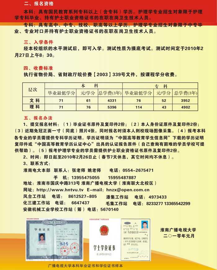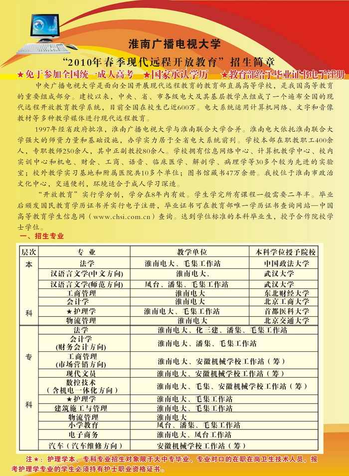 淮南广播电视大学“2010年春季现代远程开放教育”招生简章