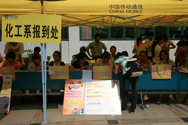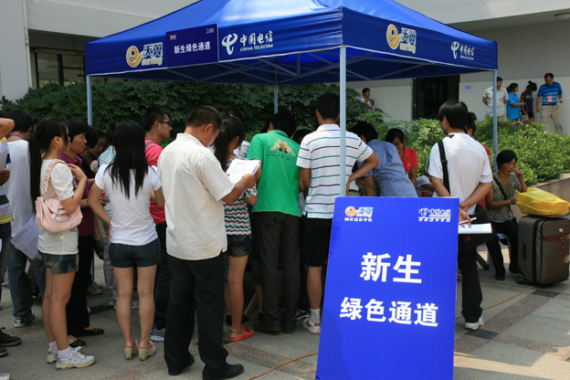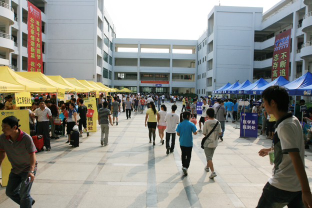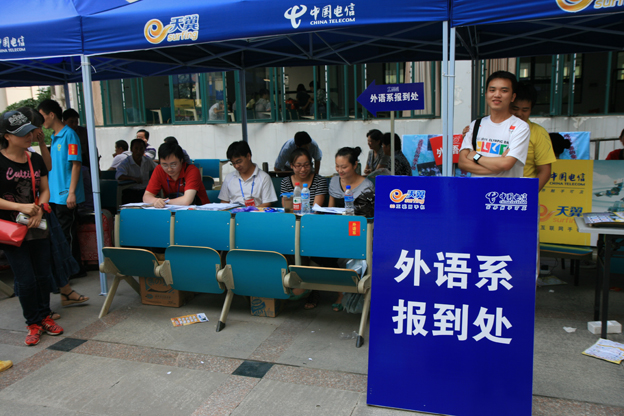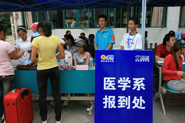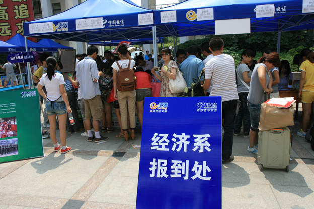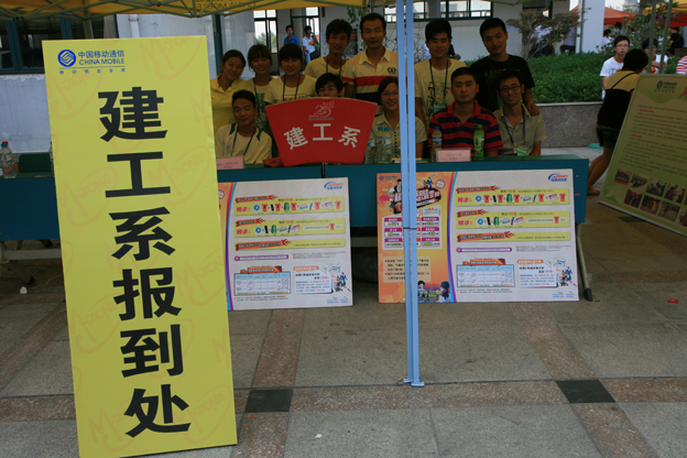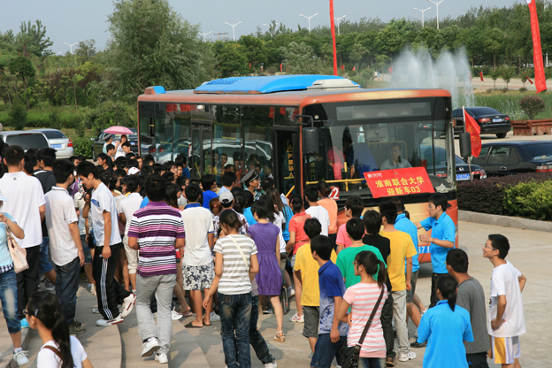 早上七时许,迎新工作就拉开帷幕。校门口迎新车辆和志愿者整装有序发往火车站和汽车站迎接新生的到来。各系迎新点、新生报到处、收费处、住宿安排处工作人员
