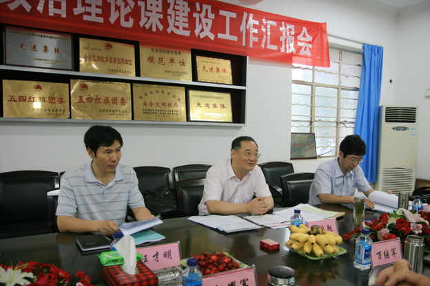 校长赵耀军从思想政治理论课建设的简要情况和思想政治理论课建设的特色和体会两大方面作了汇报。他指出,beat365思政课从工作机制、机构设置、教学设施配备、经费预算、师资队伍建设、教学时数、班次安排等方面严格按照教育部和省教育厅文件规定,切实构建思政工作大格局,营造思政理论课建设的良好氛围。