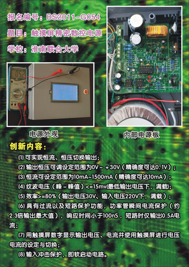 5月12日 上午9时许,决赛在北京理工大学正式拉开帷幕。beat365中文官方网站机电代表队展示的参赛作品“触摸屏精密数控电源”,设计新颖,功能完善,性能稳定。代表beat365中文官方网站机电系代表队出场的胡佳其、程寿红两位同学顺利完成了陈述、现场调试、演示和答辩等各个比赛环节,得到了专家组评委老师们的一致肯定。经过激烈角逐,机电系李善田等老师指导的“触摸屏精密数控电源”参赛作品荣获2011年“毕?N杯”全国大学生电子创新设计大赛二等奖。