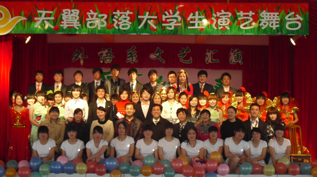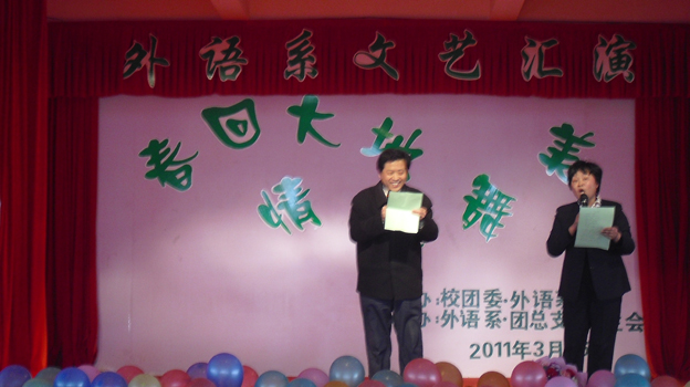 在这缤纷炫酷的舞台上,外语系人和着跳动的音符,伴着优美的旋律,舞动轻柔的身姿,一展激情的歌喉,奏响了永恒浪漫的青春。整场演出形式新颖、精彩绝伦、高潮迭起,引人入胜。轻柔优雅的舞蹈《落花》将大家引入了“落花人曼舞,烟雨蝶梦飞”的唯美情境,激情澎湃的组合歌曲《兄弟》表达的真挚情谊引起了全场观众的共鸣,令人捧腹大笑的歌曲串烧“换大米”更是赢得了大家阵阵雷鸣般的掌声,赵校长和外语系书记同唱红歌《为了谁》为演出助兴,他们那嘹亮清婉的歌声将演出推向了高潮,更向全场观众诠释了生命当珍重,大爱铸青春的深刻含义。最后,演出在外语系师生共同演绎的手语《国家》中完美落幕。