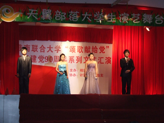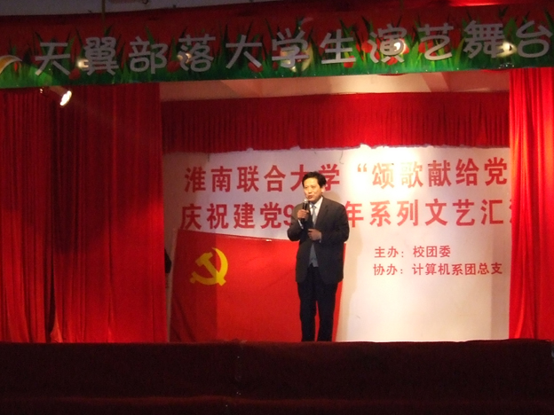 为喜迎中国共产党成立90周年,热情讴歌中国共产党的丰功伟绩,弘扬伟大的“五四”精神,培养广大青年学生对党的朴素情感, 4月21日,计算机系“颂歌献给党”暨“举五四风帆、载理想远航”文艺演出在大学生演艺厅成功举办。校长赵耀军,校党委副书记朱亚非,校党委委员、组织人事部部长白存良及部分系部负责同志观看了演出。