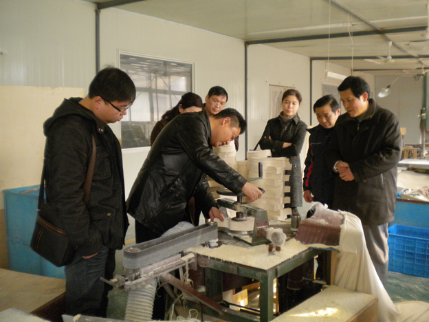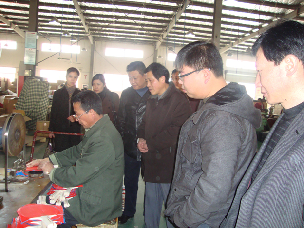 赵校长一行在安徽国奥体育用品制造有限公司总经理赵守旗等人的陪同下,考察了球拍生产车间,参观了生产制作流程。随行的科研处、外语系、机电系有关负责人和专家现场察看了球拍切割、雕花等智能化生产设备在作业过程中出现的技术问题。随后,双方围绕工艺改进、设备改装、技术革新等方面进行了深入洽谈。校长赵耀军等有关专家提出了切实可行的技术攻关设想,并与安徽国奥体育用品制造有限公司达成了科研合作意向。