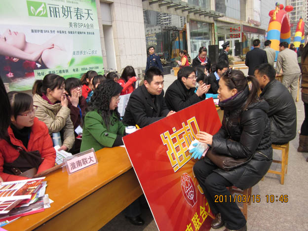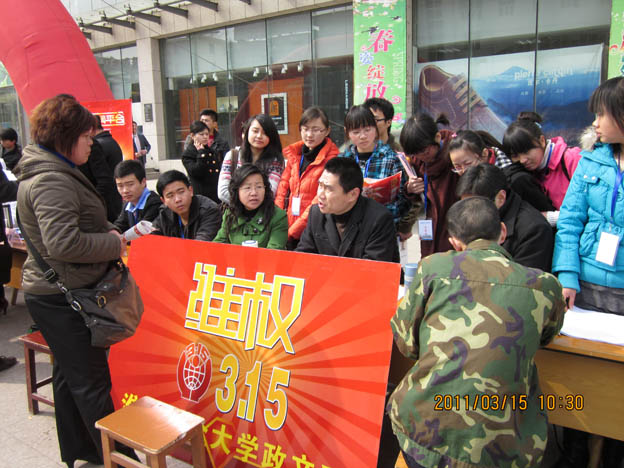 3.15当天,政文系法律教研室老师带领学生一早来到活动现场,向市民发放传单,就市民咨询的问题进行耐心细致的解答。这次现场咨询,老师们为学生上了一堂生动的社会实践课,同学们感到收获很大,效果很好;这场实践活动,赢得了广大市民的赞许,塑造了联大良好的社会形象。