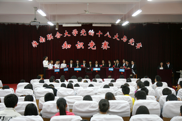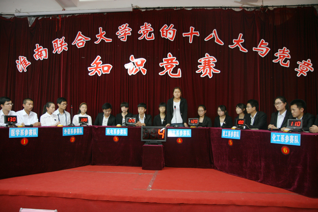 经过前期紧张的备战,有六支代表队参加决赛。决赛分必答题、抢答题、风险题三部分。比赛现场气氛紧张热烈,台上18名参赛选手思维敏捷、答题流利、表现出色,台下观众积极呼应、不时发出阵阵热烈掌声。在抢答题环节,外语系代表队表现不凡,给大家留下了深刻的印象。比赛过程中还穿插进行了观众互动答题等环节,提高了参与的广泛性。经过激烈争夺,外语系代表队荣获比赛一等奖,政文系代表队和建工系代表队获二等奖,医学系、化工系和机电系代表队获三等奖,计算机系和经济系代表队获得优秀奖。