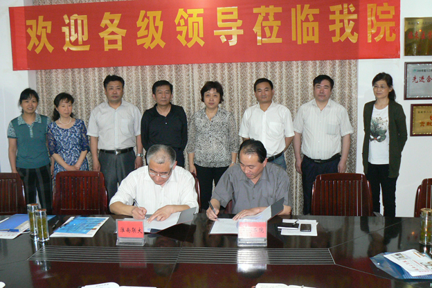 在祥和气氛中,医学系主任和贾院长代表双方在协议书上签字。