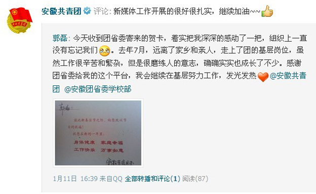 2、带动单位的宣传工作迈上新台阶。一年以来,郭磊在安徽青年少年网发布新闻82条;在宣城青年网发布新闻94条;在《皖南晨刊》报登稿9条;在《今日郎溪》报登稿41条。数条微博被团中央转发及评论;新浪和腾讯微博被团省委、团市委合计转发70余条;多条新闻被中国共青团网、新浪网、网易网、中安在线、宣城新闻网等网站转载,登稿量和发表量均为服务单位历年之最。
