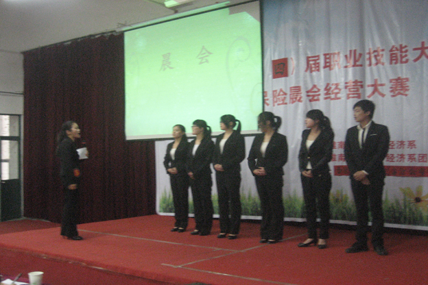 4月18号下午,经济系在W220报告厅举办了第四届职业技能大赛之保险晨会经营比赛,出席本次比赛并担任评委的有校长赵耀军、副校长尚文、经济系负责人、骨干教师,以及泰康人寿浙江省中心分公司电销中心负责人。