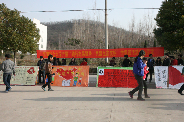 伴随着嘹亮的学习雷锋歌声,在博学路两旁,学校各社团积极响应,亮出展板,发起“学雷锋树新风”等弘扬雷锋精神的标语。活动旨在弘扬雷锋精神,倡导文明新风,深化创新志愿者行动,并用实际行动,响应号召。志愿者们分工合作,积极行动,充分发挥着雷锋精神,一丝不苟的清扫地面,清理卫生死角,使校内灯火广场、凉亭、宿舍等地方焕然一新,为同学们营造了良好的校园环境。
