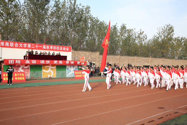 8时30分,伴随着雄壮高亢的《运动员进行曲》,在鲜艳的国旗和校旗引领下,8个系的运动员代表组成整齐有序的方阵,迈着矫健的步伐有序步入运动场。