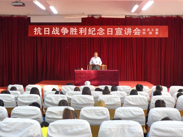 在宣讲开始之前,师生们为抗日战争牺牲的英勇烈士们进行了默哀。本次宣讲会邀请到关工委的卢凡爱老师,他为广大师生做了一场别开生面的报告。他在宣讲中指出,抗日战争胜利纪念日是为了铭记中国人民反抗日本帝国主义侵略的艰苦卓绝的斗争,缅怀英烈以及为抗日战争胜利作出贡献的人们,表明中国人民维护国家主权、领土完整的坚定立场,弘扬以爱国主义为核心的民族精神。希望广大青年要牢记历史,勿忘国耻,好好学习,坚定信念,从小事做起,树立远大目标,传递正能量。精彩的宣讲打动了在场的每一位同学,让同学们对抗日战争的历史有了更深刻的了解,深知和平的不易,会场响起阵阵热烈的掌声。