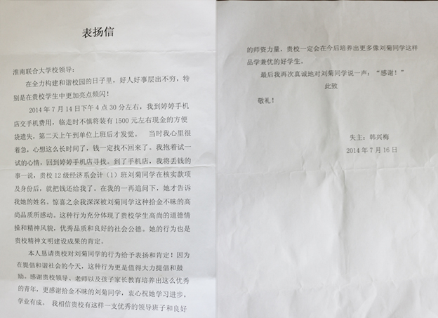 经济系2012级会计①班刘菊同学在暑假社会兼职期间,拾金不昧,用实际行动展现了淮南联大学生优秀的个人品质,充分体现了beat365学生高尚的道德情操和精神风貌,受到失主和周边老百姓的交口称赞,为学校赢得了良好的社会声誉。