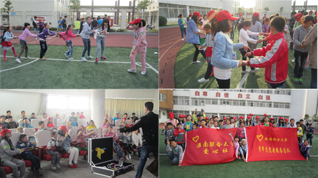 下午三点,志愿服务队伍到达学校,开始与那些聋哑儿童交流、玩耍。春不语,春天却能催醒百花;爱不语,爱却能暖人心田。伴随着《明天你好》手语表演的旋律,我们也在心中默默地为他们祈祷着,祝福着。接着,是志愿者带来的魔术表演,一连串奇幻的魔术,激发了孩子们原本的纯真和可爱,在他们安静的世界里,其实也渴望那如雷般的掌声和熙熙攘攘过往的人群,给他们温暖,给他们传递爱的声音。时间总是在飞逝,夕阳西下,我们也在户外的游戏中结束了今天的志愿服务活动,余晖相映的笑脸,是给本次志愿服务活动最好的诠释。