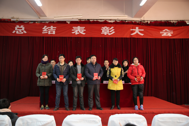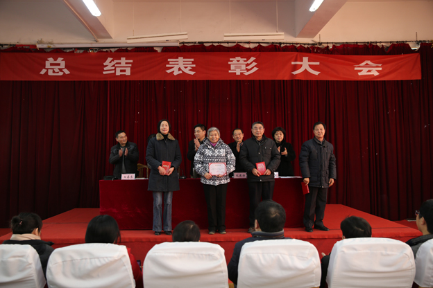 纪委书记白玫宣读《关于2014年年度考核结果的通报》和《关于表彰先进集体 优秀教师优秀教育工作者 颁发老同志贡献奖的决定》。校领导为获表彰的代表颁发荣誉证书。