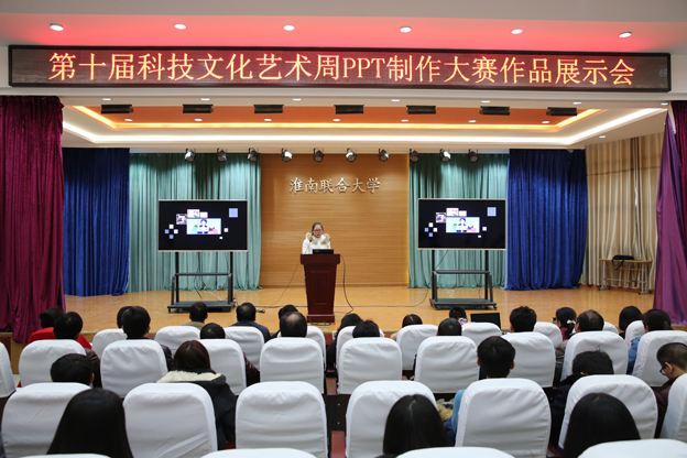 11月24日下午,第十届科技文化艺术周PPT制作大赛作品展示会在南区一号报告厅成功举办。副校长尚文、副校长白存良、党委委员、工会主席薄勇出席活动并为获奖选手颁奖,宣传部、教务处、院系负责同志以及师生代表参加了展示会。