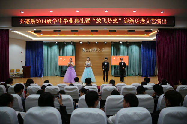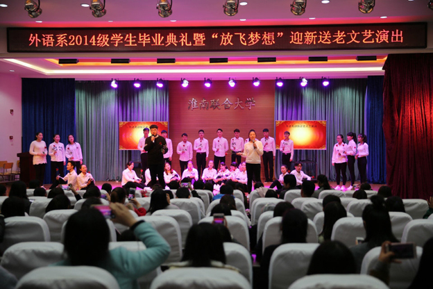 毕业典礼在雄壮的国歌声中拉开了序幕,典礼由系主任主持。典礼上,首先授予了2014级李硕等6位学生外语系“优秀毕业生”的光荣称号。随之,毕业生代表饱含深情的发言,感动了现场的每一个人。最后,外语系党总支书记寄语了对毕业生的美好祝福和无限期待。毕业典礼后,“放飞梦想”迎新送老文艺演出在一支激情四射的爵士舞中渐渐升温,动听的歌曲,优美的舞蹈,搞笑的曲艺节目,在将演出推向高潮的同时,也勾起了学生们对往事的回忆,对未来的向往。演出在一曲动情的大合唱《栀子花开》中落下帷幕。