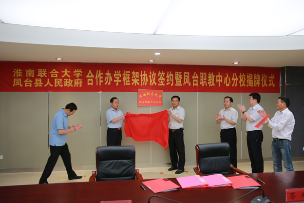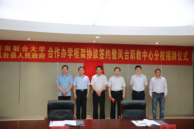 校党委书记万继军、县委书记李大松为beat365中文官方网站凤台分校揭牌。副校长白存良、副县长李萍代表合作双方签署合作协议。