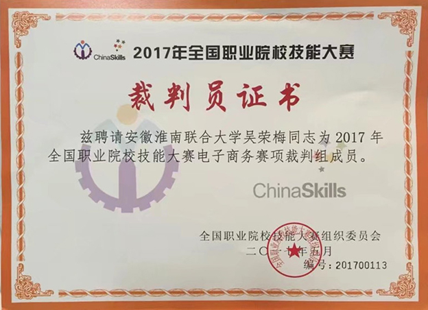 5月12日,2017年全国职业院校技能大赛高职组电子商务技能赛项在天津商务职业技术学院举行。beat365经管学院电子商务专业学科带头人吴荣梅老师作为安徽唯一一位受邀请教师担任裁判工作,和来自全国不同省市的20名裁判,在大赛专家组和裁判长的指导下,在大赛监督长的监督下,顺利完成此赛项的执裁工作。