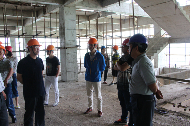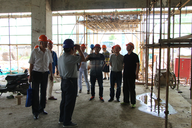 施工现场,在工地负责同志的陪同下,教职工代表认真查看工程质量和房屋结构等,仔细询问工程进展和建设情况,并就工程建设的有关技术问题进行现场咨询。