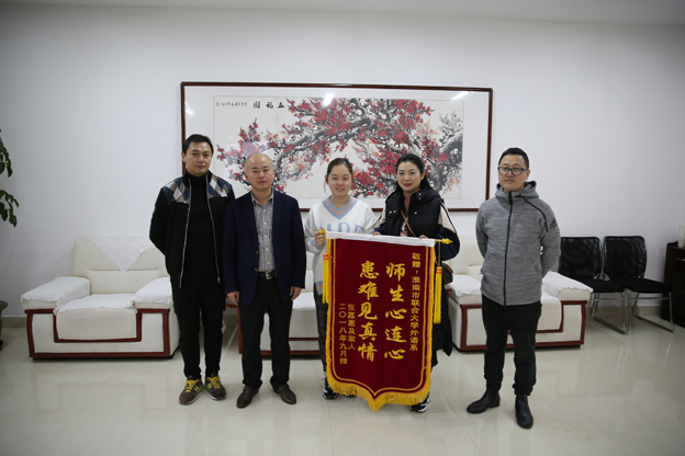 11月6日下午,在校办公楼五楼会议室,外语系2016级张嘉惠同学的家长送来了写有“师生心连心,患难见真情”的锦旗,副校长倪刘根和外语系负责同志亲切接待。