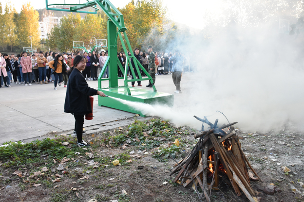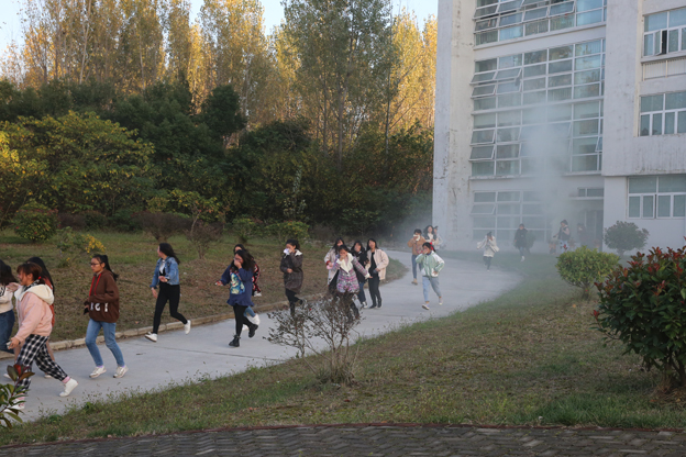 11月9日下午,伴随着浓烈的烟雾与刺耳的警报,女生四号公寓楼、综合服务楼的火灾报警系统准时拉响。宿舍管理人员迅速打开宿舍楼的所有出口,各楼层负责疏导的工作人员迅速到位,组织学生沿安全通道、紧急疏散路线快速有序疏散,帮助同学们尽快撤离火灾现场。整个过程用时3分钟,同学门按照既定的逃生路线疏散到操场,迅速以年级、班级为单位清点人数。随后,保卫处的同志向同学们讲解了灭火器的使用方法,部分同学在灭火演练现场参与了灭火体验活动。共有数百名师生员工参加了本次消防演练。