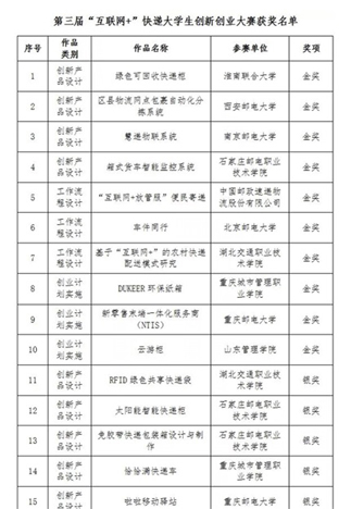 11月29日,第三届中国“互联网+”快递大学生创新创业大赛在重庆邮电大学落下帷幕。beat365汪澍东,牛国鹏两位教师指导的beat365中文官方网站绿创队项目“绿色回收型快递柜”脱颖而出,以本项目总分第一的成绩力压群雄,获得大赛金奖。