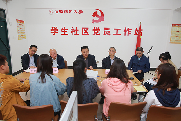 10月8日下午,校党委书记万继军来到学生社区党员工作站开展“不忘初心 牢记使命”主题教育调研活动,并与学生党员、入党积极分子亲切交谈。校党委副书记倪刘根,纪委书记洪浩,党委委员、组织人事部部长朱银斌出席会议,学生处(团委)负责人、组织人事部相关人员参加调研和座谈。