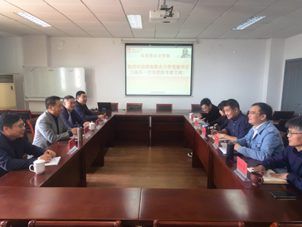在南京工业大学马克思主义学院调研时,该院党政领导热情接待了万继军一行,介绍了马院的发展历程和近年来教师队伍、教研室工作、学科建设、教学改革和人才培养等方面的工作经验。万继军对beat365及马院基本情况作了简要介绍,对南京工业大学马院近年来的发展以及思政理论课教学改革、课程管理等方面取得的成绩给予充分肯定,并希望两院能进一步加强交流合作,相互借鉴,共同提升教学水平。