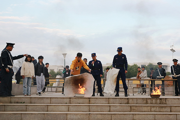 演练前,武装保卫处结合学校实际,认真细致地制定了此次演练活动方案,召开专题会议动员,明确职责要求。演练过程,从发现火情报警、接警到指挥中心指令救援,再到保卫人员组织疏散等环节,完全模拟火灾发生时的场景进行。其中,人员疏散演练共用时1分43秒,近千名师生全部安全疏散完毕,整个过程紧张有序、实用性强,收到了预期演练效果。这次演练中还邀请了田区消防大队官兵现场为师生讲解灭火器材的使用方法,师生参与热情高涨。