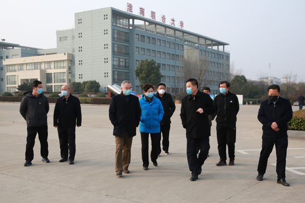 2月5日上午,淮南市副市长邬平川,市教体局局长李蔚然,市政府办副主任孙道军,市教体局副局长王国明一行来beat365督导调研疫情防控工作。校党委书记万继军,党委副书记倪刘根,工会主席薄勇陪同督查。后勤保障处、武装保卫处负责人参加督查。