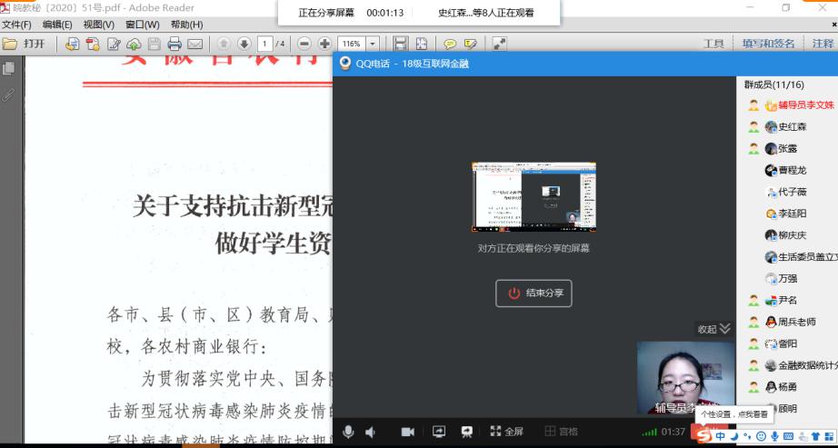 在进行网上课程资源建设、熟悉网络上课流程的基础上,辅导员积极指导学生适应网课模式,配合任课老师上好班级的网络课程,将“停课不停学”落到实处。核对学生职教云用户信息、查看并向学生发布课表、建立班级上课QQ群、配合各科老师加群并安排试播时间、调查学生线上学习条件有无困难。每天“走”进班级上课群,了解平台运行情况、学生出勤情况,维持正常教学秩序,争取提供优质的“云服务”。在毕业班学生中紧抓就业指导,积极向毕业班学生宣传“安徽省2020年春季网络招聘会”,引导学生正确登陆平台浏览招聘信息,做好贫困学生就业帮扶,鼓励他们多了解招聘信息,积极投递简历。