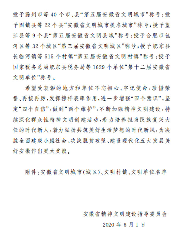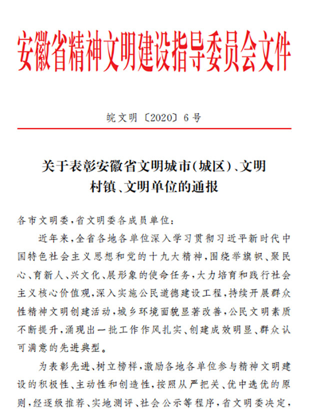 近日,根据安徽省精神文明建设指导委员会公布的《关于表彰安徽省文明城市(城区)、文明村镇、文明单位的通报》(皖文明[2020]6号),beat365被授予第十二届“安徽省文明单位”荣誉称号。这也是beat365相继获得第十届、第十一届“安徽省文明单位”称号后再次获此殊荣。