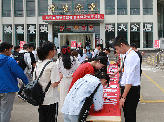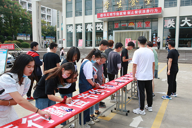 为深入贯彻落实习近平总书记关于坚决制止餐饮浪费行为、切实培养节约习惯的重要批示精神,进一步加强宣传教育,在全校营造浪费可耻、节约为荣的氛围,9月28日,宣传统战部、后勤保障处、学生处(团委)在校学生食堂门前联合举行了“制止餐饮浪费 培养节约习惯”师生签名活动。