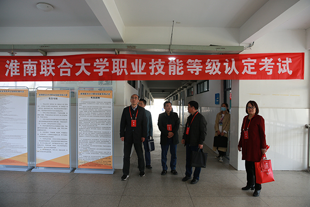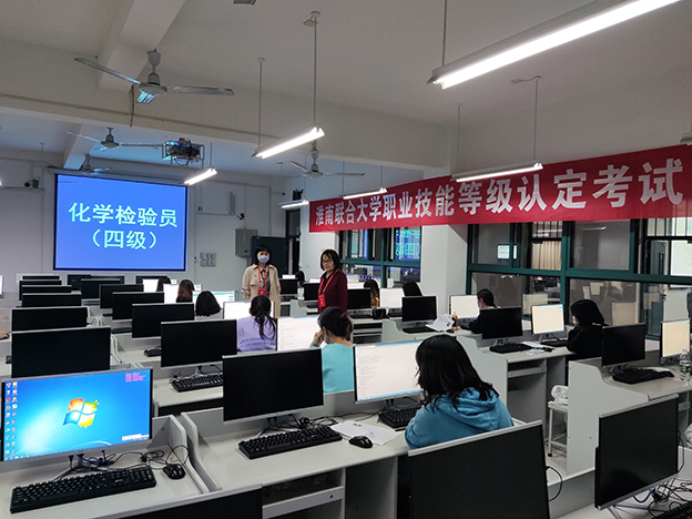 为保证本次认定考试工作顺利进行,实训中心牵头制药与材料学院、网络中心等部门认真组织、精心安排,在认定申报、组织报名、考场安排、考务培训、认定评判、疫情防控等方面做了大量的准备工作。在做好疫情防控工作的基础上,考试过程严格有序,相关人员各司其职,学生秩序井然,认真考试。淮南市人社局张新辉局长、市职业技能鉴定指导中心段怀伟主任和周炳吉、徐晓玮、汪国强一行到现场指导,对认定工作现场进行了监督,并对考场的组织管理、考场纪律和考生考试状态给予了充分的肯定。