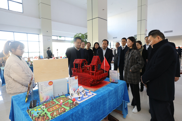 科技创新作品区的作品由淮南市各职业院校精心选送,每一件作品都是学生智慧的结晶。这些作品主要分为科技发明、技能制作、科普绘本、科普动漫、科普微视频、科学实验秀等八大类,共计100余件。随后校领导又参观了书画摄影展,书画摄影展共收集作品240余份,经过两轮筛选共展出90余幅书画作品和近80张摄影作品,作品紧紧围绕“礼赞建党百年,共创职教辉煌”这一主题,形式多样、立意新颖、题材丰富。以不同角度呈现出在中国共产党带领下,联大师生传承红色基因,感恩党、跟党走、砥砺前行的精神风貌。