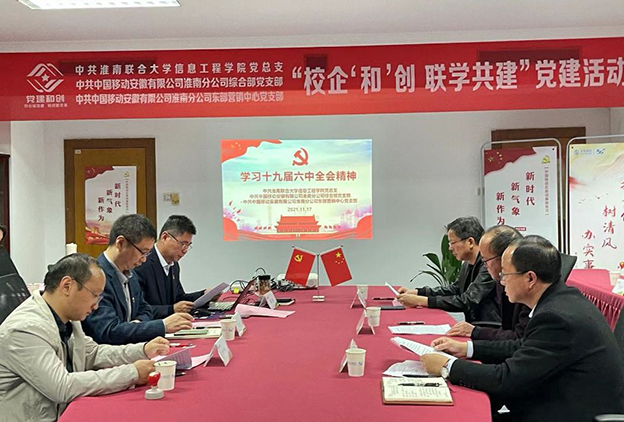 在交流互学座谈会上,参加活动的领导和党员同志先后做了交流发言,共同学习了《中国共产党第十九届中央委员会第六次全体会议公报》。信息工程学院党总支与淮南移动东部营销中心党支部、综合党支部签订了《“校企‘和’创 联学共建”倡议书》