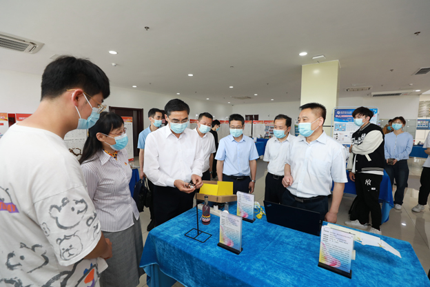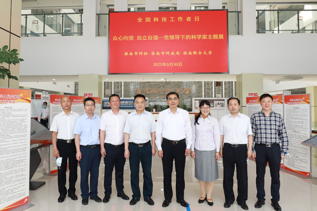 5月30日上午,在第六个“全国科技工作者日”来临之际,淮南市科协、淮南市科技局和beat365共同举办的“众心向党·自立自强——党领导下的科学家”主题展,淮南市职业院校校外科技作品展在校图书馆一层展出。市委副书记汪谦慎,市科协主席王安锐,市科技局党组书记,局长刘银现场参观主题展。市政协副主席、校党委书记万继军,校长李辉,副校长罗鸿陪同参观。