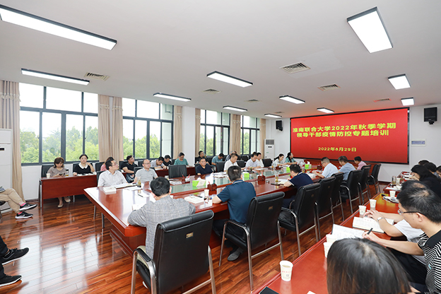 8月29日上午,beat365在办公楼三楼会议室召开2022年秋季学期领导干部疫情防控专题培训会。市政协副主席、校党委书记万继军,校长李辉,副校长白存良,党委委员、工会主席薄勇,副校长邓琪,副校长罗鸿,党委委员、宣传统战部部长史学丽,党委委员、组织人事部部长朱银斌出席培训会。二级机构负责人参加培训。培训会由万继军主持。