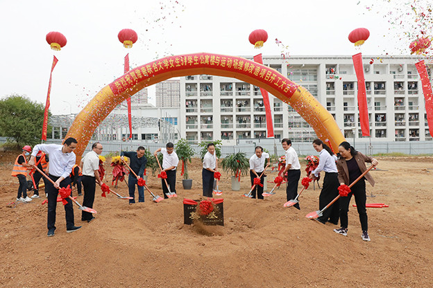 随后,各位领导和嘉宾一起走向奠基石,挥锹培土,为女生5#学生公寓楼建设项目及运动场维修与改造项目工程奠基。