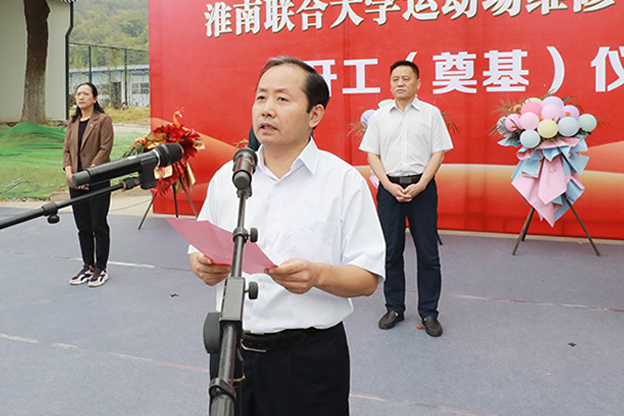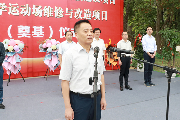 市政协副主席、校党委书记万继军宣布女生5#学生公寓楼建设项目及运动场维修与改造项目正式开工。