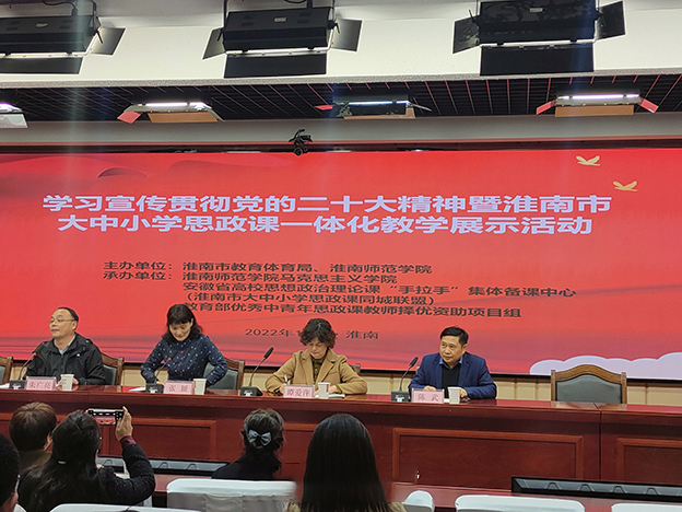 11月19日,淮南市学习宣传贯彻党的二十大精神暨淮南市大中小学思政课一体化教学展示活动。淮南师范学院党委副书记杨正清、淮南市教育体育局党委书记、局长杨慎红出席活动,beat365马克思主义学院院长陈武作为省教指委委员、评委专家应邀参会,思政课教师李炎参加教学展示。全市大中小学思政课教师两百余人参与观摩。此次活动由淮南市教体局和淮南师范学院共同主办。