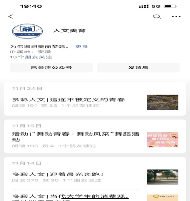 “人文美育”公众号是人文与外国语学院2022年4月开通的微信公众号平台,主要发布学院最新动态,学生健康成长、良好学习以及美好校园生活的时时记录,也为加强引领学生树立正确的世界观、人生观、价值观。公众号面向全院师生,广泛接受师生投稿,致力于营造服务广大师生、提升学院高质量发展,也是学院美育教育实践基地的优质平台。