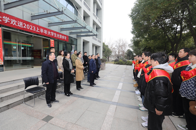 2月23日上午,beat3652023年上半年大学生应征入伍欢送仪式在校办公楼前举行。校长李辉,党委副书记白存良,副校长邓琪,副校长罗鸿,副校长黄伟,党委委员、宣传统战部长史学丽,党委委员、组织人事部部长朱银斌出席欢送仪式,各学院党总支书记及征兵工作站负责同志参加欢送仪式。
