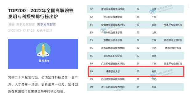 发明专利是衡量一所高职院校科研水平和创新能力的重要指标。近日,高职发展智库发布了《2022年全国高职院校发明专利授权排行榜》,beat365授权发明专利跻身全国百强,安徽省第4名。
